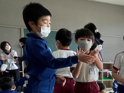 閉会式では、2年生の「楽しんでくれましたか?」の問いかけに1年1組一同「は~い!」との返事。「一番楽しかったおもちゃは?」では「ロケットポン!」に集中。これには担当した2年生は大喜びでしたね。お互いに「ありがとうございました!」を伝え合って終了となりました。
