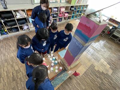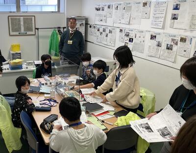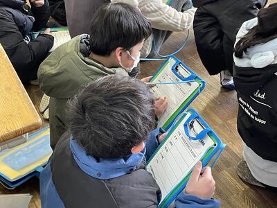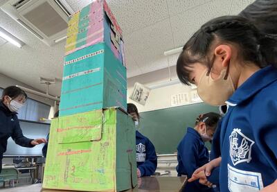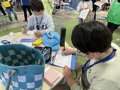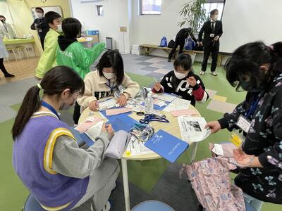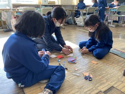 さて、その後の2年生、すぐに反省会。「つくったおもちゃで楽しく遊べました!」と言う一方で、今の時間でお土産の景品を配りすぎてしまい、この後にやってくる1年2組の分はあるのか?ということになりまして、おもちゃのメンテナンスとともに急ぎお土産づくりへと...。