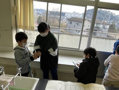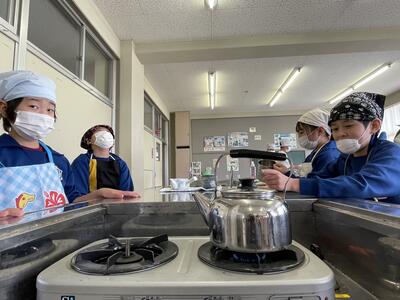 2月7日(火)、5年2組の子どもたちから「お茶しに来ませんか?」とのお誘い。どうやら調理実習の一環で日本茶をたしなむことになったようで、誘われるままにいざ調理室へ!子どもたち、本当に楽しみにしていたようで、お湯が沸くまでの時間もじっとやかんを見つめて集中していました。