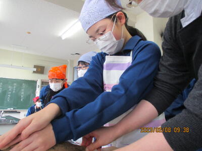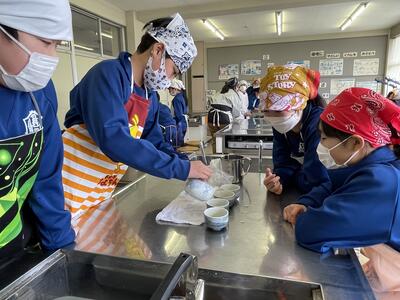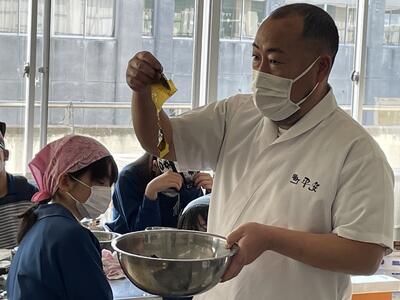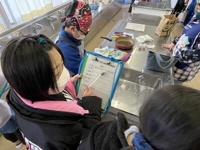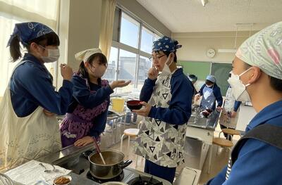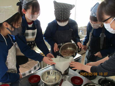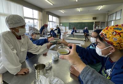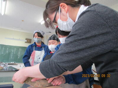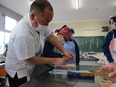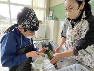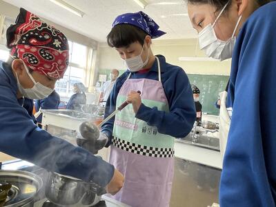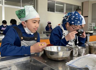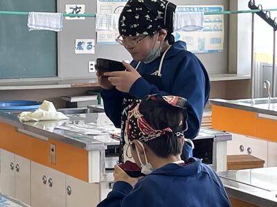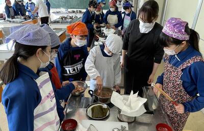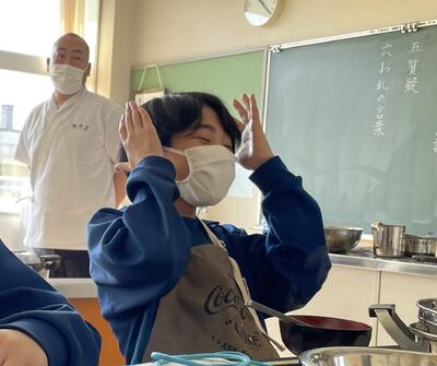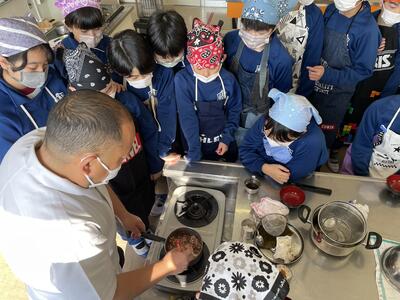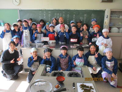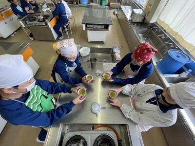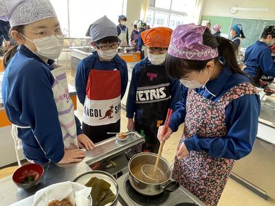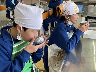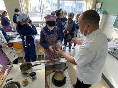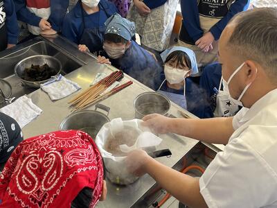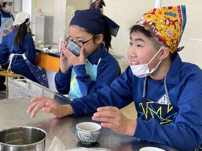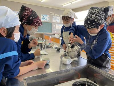 2月8日(水)、食育の一環として発酵食品に注目した学びを展開してきた6年生、今回は講師に城山平安荘の鈴木伸明先生と松本先生をお招きして「出汁出前教室」を実施しました。子どもたち、これまで鰹節等の学習をしてきましたので、どうすると出汁になるのか興味津々。先生の説明を聞いて、サポートしていただきながら作業を進めていきました。