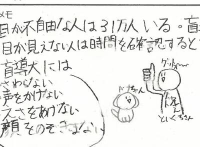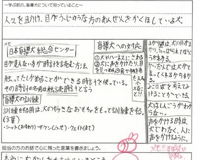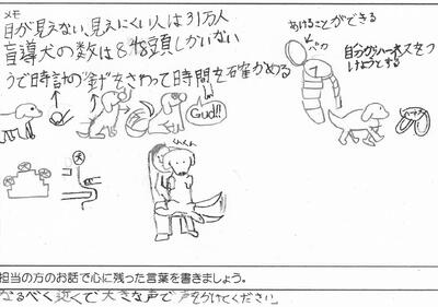 子どもたちの記録より。「盲導犬は日本に848頭、目が不自由な方は31万人なのでまだまだ少ないな」「本当に犬が人を助けているところ、盲導犬という言葉の意味、犬にもストレスを与えないように、という言葉が心に残りました」「盲導犬に『グッド』と声をかけながら命を預ける信頼関係をつくっている」「盲導犬が自分からハーネスをつけようとしている」「盲導犬の訓練や目の不自由な人の生活を絵や文字を用いてわかりやすく説明してくださいました」「盲導犬のおかげでやれることが増えること」「触読時計やスマホを使って生活している」「盲導犬にしていはいけないこと」「あいさつから始めてもいいから、声をかけてみてくださいとのことなので、見かけたら声をかけてみようと思います」「盲導犬を連れている人、白い杖をついている人がいたらまずはあいさつから」