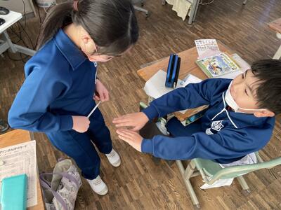 こちらは輪ゴムのパワーを使った「パッチン(パッチンかえる君)」。最初は折ってありますが、だんだん開いていって、開ききったところでパッチンと鳴って飛び上がる!というおもちゃ。飛び上がったの見えます?手を取ってやり方をレクチャー。ここでも「これが高く飛ぶよ!」と教えちゃっていましたが。1年生、パッチンの勢いにビックリしていましたね!