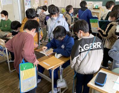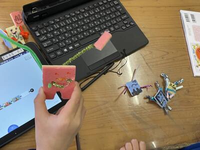 1年1組では、図工「すきまちゃんのすきなすきま」の授業。自作したキャラクター「すきまちゃん」を教室内のお気に入りの隙間に置いて、その様子をタブレットで撮影して紹介し合っていました。「あそこだ!」「かわいい!」「なんでそこに置いたの?」「え~そんなことしているの~」と学びが発展していました。ICT支援員さんのサポートにより、子どもたちは安心して楽しく活動していました。