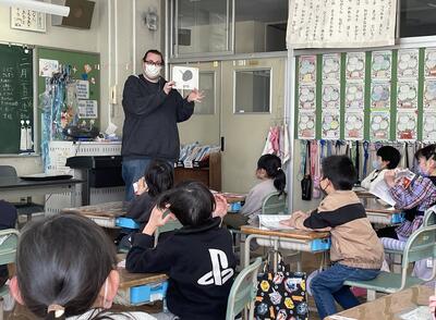 1年2組では、ALTのデニス先生と英語でコミュニケーション!カードで示された色の名前を英語でテンポ良く答えて盛り上がっていました。「それ知ってる!レッド!」「OK!Good!」「Yeah(イェーイ!)」