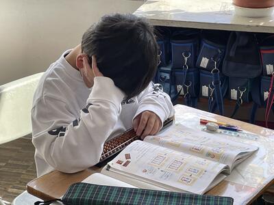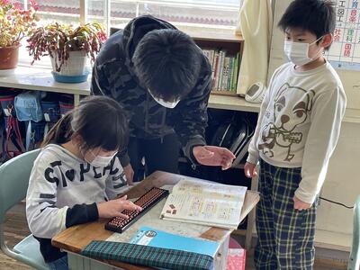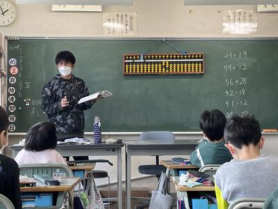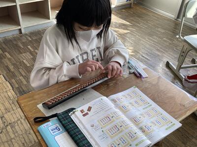 3年2組は算数。算盤で2桁の足し算にチャレンジ!玉の置き方・はじき方のこつをつかむと一気に計算スピードがアップ。一方で「頭がこんがらかった!」と先生も混じってどうするこうするのと議論する様子も。「計算機って便利すぎる!」ことを実感していました。