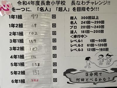 そう言えば、明日がなわとび月間の最終日。個人の記録はどうですか?学級単位で取り組む「長なわチャレンジ」は現在この通り。どこまで記録を伸ばすことができるか楽しみですね!