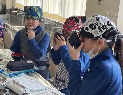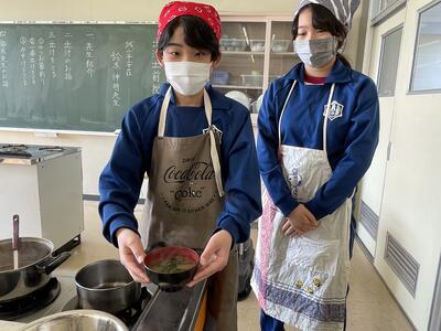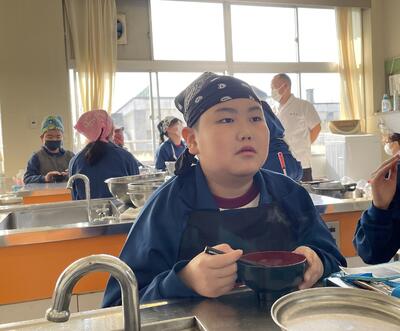 すると徐々に「おー!この香りこの香り。成功だね!」の声、嬉しそう。しかし、これだけにとどまりません。取り出した一番出汁に、今度は地元醸造店から仕入れてきたお味噌を投入!すると「これはやばい!さらに香りが美味しくなったよ」との声が。さらにさらに、具材はわかめにしよう!ということで新鮮わかめを投入すると、もはや子どもたちの心はとろけてしまいました。「これはだめだ!香りだけでお腹いっぱいだわ!」とため息交じりで...。