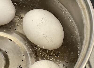 それで16日(木)、今度は5年1組が調理実習をするとの情報を聞きつけ、さりげなく調理場面に入らせていただきました。ゆで卵づくりに初めてチャレンジするという声が多くて、お湯加減を慎重に見極め、ストップウオッチを持つ手もだいぶ力が入っていましたね。みんなで卵をころころ転がしていたら「あっ、卵が割れちゃった!」の声が。どうなってしまうのか...。これも一つの学びですね。
