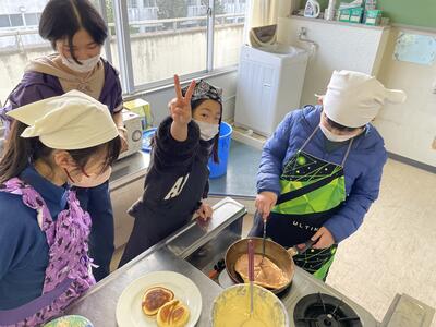 料理・手芸クラブでは、ホットケーキ作りを見学。まだ調理前だったこともあり、3年生男子は「これからつくるのか...」と残念がっていました。「他にはどんな活動をやるのですか?」と質問をしていましたね。