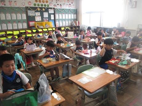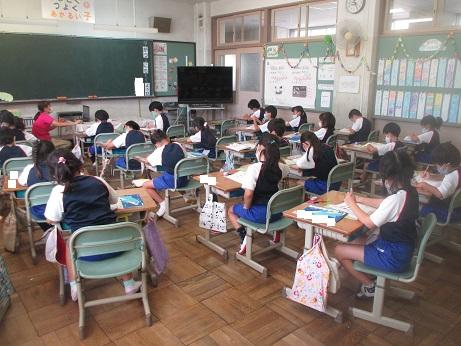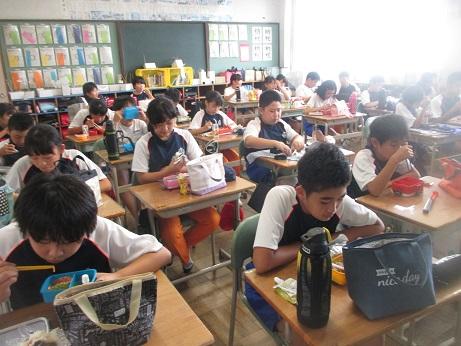 今日は、5、6年生の授業の様子を紹介します。5年生は、理科で「顕微鏡の使い方」のまとめの学習に取り組んでいました。今後、様々な植物や生物を顕微鏡で観察するようになるので、使い方を学ぶことは重要ですね。6年生は、図画工作科で「防火用の歩スター」制作に取り組んでいました。本来、夏休みの課題として取り組んできたものですが、今年度は、新型コロナウイルス感染症のため、例年より募集が遅れ現在制作するようになりました。今日は「お弁当の日」でもあるので、各学年の様子を紹介します。お弁当の日は、みんなとても嬉しそうに食べます。きっと自分の好きなものが入っていて、家族が一生懸命作ってくれるのが分かっているからですね。