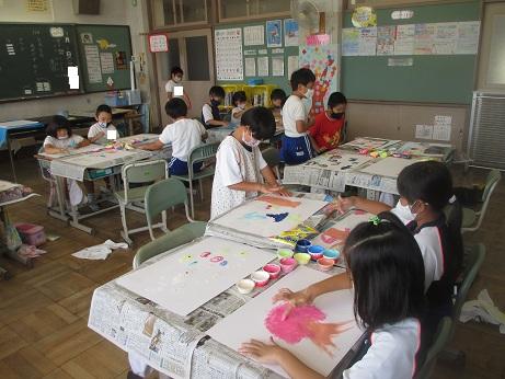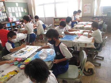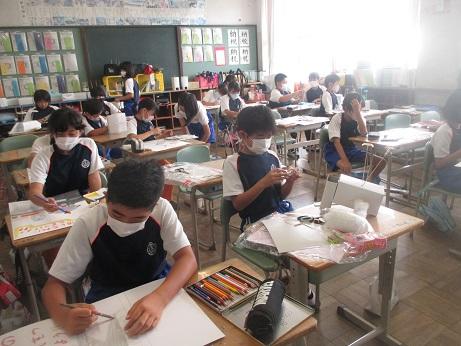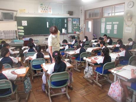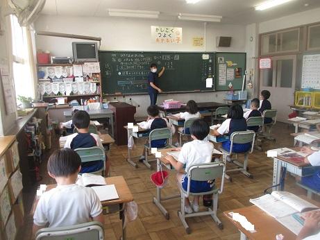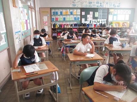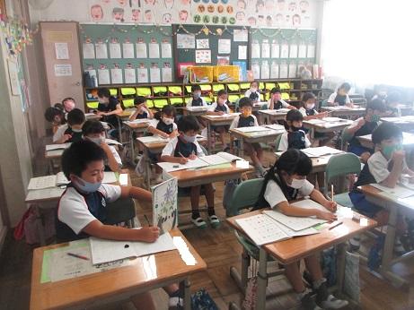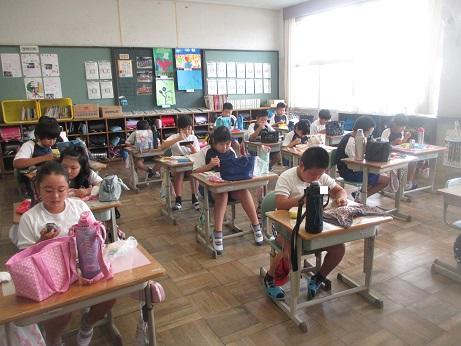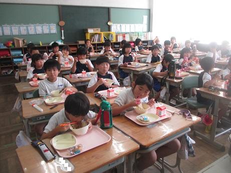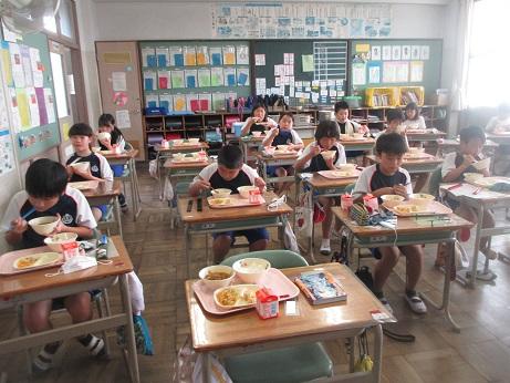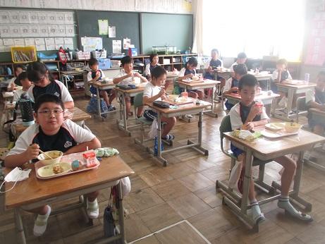 今日は、1、2年生の学習の様子を紹介します。1年生は、生活科で「夏の植物」を探していました。普段は気にも留めない草花でも、改めて探してみると「きれい」「かわいい」といって嬉しそうにしていました。2年生は、算数科で「3位数-2位数」ひき算の筆算に取り組んでいました。繰り下がりが2つある筆算で、「できる」との声がある一方、少し時間がかかる子もいたようです。給食は、3、4年生の様子です。