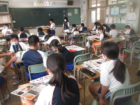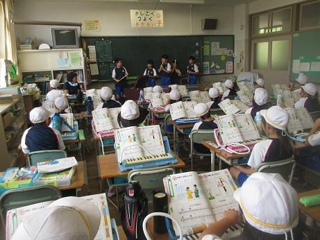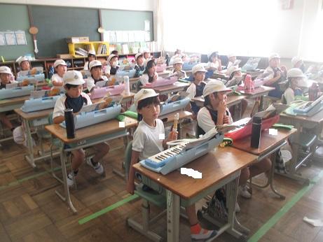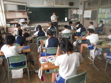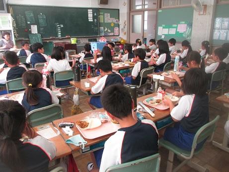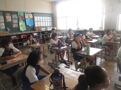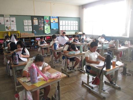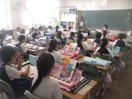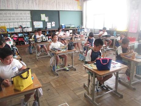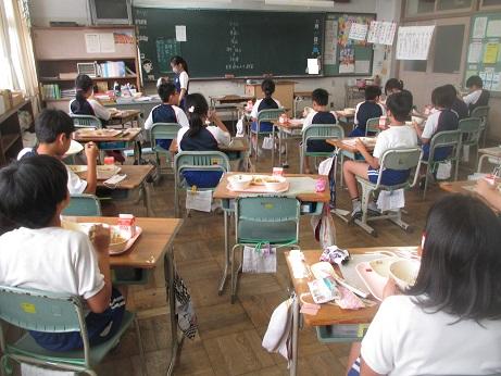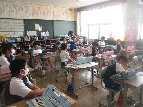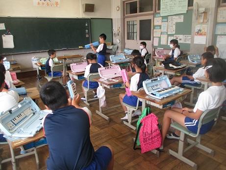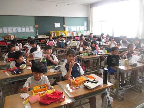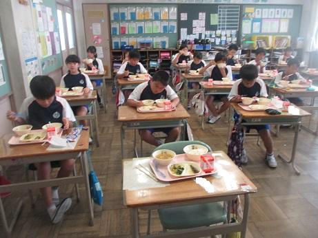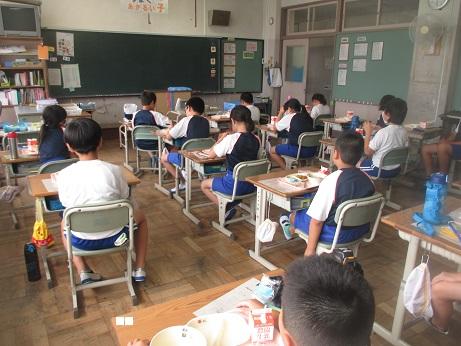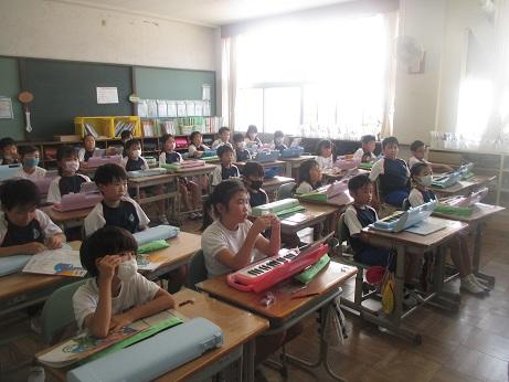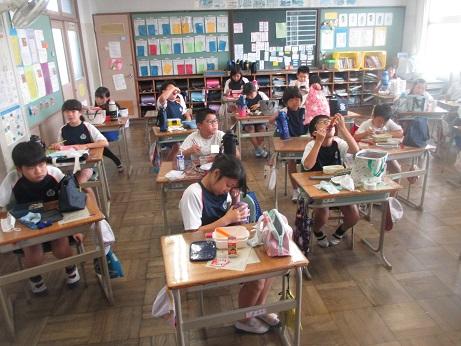 今日は、3、4年生の授業の様子を紹介します。3年生は、音楽科で「リコーダー」の練習をしていました。3年生にとって初めてのリコーダーは、決してやさしいものではないようです。4年1組は、社会科で「福島県の白地図」を仕上げていました。市町村の位置や数を確認しながら進めていました。4年2組は、音楽科で「鍵盤ハーモニカ」を使って校歌を演奏していました。きっと9月17日(木)のスポーツフェスティバルで披露する「鼓笛演奏」に備えてのことだと思います。給食は、5、6年生の様子です。放送委員会の児童の留守中に訪れることが多く申し訳ないです。放送委員のみなさん、いつもありがとう。