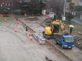 児童のいない学校では、今、工事が進んでいます。既にお知らせしていることですが、校庭の西側では舗装工事が、体育館と校舎内では、特別支援学級の新設に向けた廊下などのバリアフリー化工事と、1階東側トイレの改修工事が進んでいます。