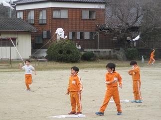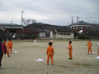 今日は、1年生が校庭で「たこあげ」をしました。自分で絵を描いた「たこ」を、各自があげます。風が少し弱かったので、子どもたちはたこを持って校庭を元気に走り回りました。これは、生活科の学習「ふゆを たのしもう」の一環です。
