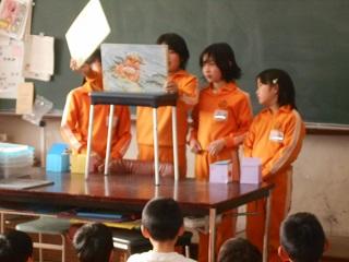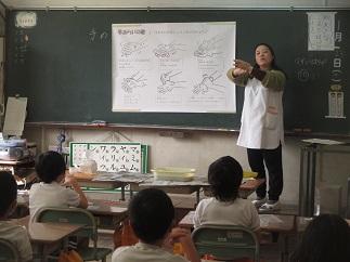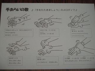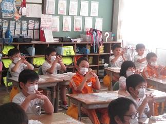 今日の3校時目に、1年生の「上手な手の洗い方」の授業を、担任と養護教諭がいっしょに行いました。でんぷんのりとうすめたヨード(うがい薬)を使って、手の洗い残しを見えるようにして確かめた後、小野養護教諭作詞の「手洗いの歌」をみんなで覚えました。給食前の手洗いの時にも、廊下から歌が聞こえてきていました。
