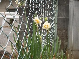 校舎裏の駐車場入り口のスイセンが、もう咲いています。ここは昨年も一番に咲きました。