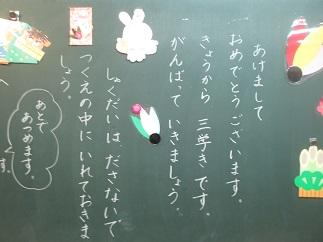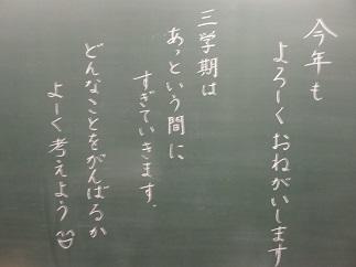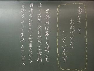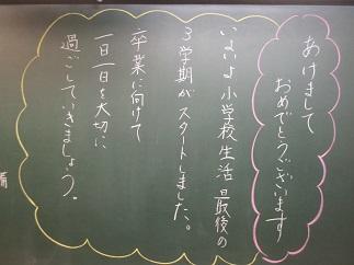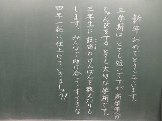 冬休みは今日で終わり、明日からは、いよいよ3学期が始まります。無事に冬休みを過ごし、みんなそろって始業式ができるのが何よりうれしいことです。明日は、元気な子ども達の顔を見るのが楽しみです。なお、明日は11:00に一斉下校です。給食はありません。