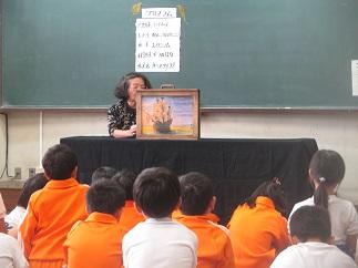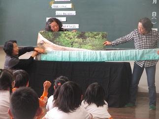24日(木)の2・3校時に、「子どもの読書環境を豊かにする会」から吉岡さん、大津さん、赤津さんの3名においでいただき、1・2年生で「出前絵本の読み聞かせ会」を行いました。プログラムは、1大型絵本『しげちゃん』、2おはなし『かめのこうらはひびだらけ』、3絵本「おならうた」、4科学絵本『ぞうのはな』、5紙芝居「海へびサイラス」です。子どもたちは、次々出てくるお話に引き込まれて、あっという間に時間が過ぎました。佐々木学校司書も同席しました。「子どもの読書環境を豊かにする会」の皆様、ありがとうございました。