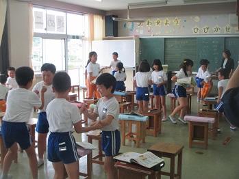 写真は、上の2枚が1年生、下の2枚が4年生の授業の様子です。