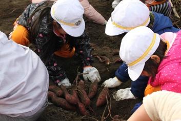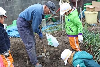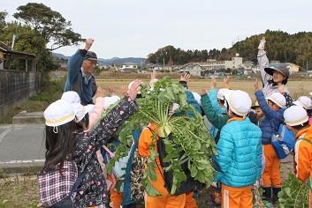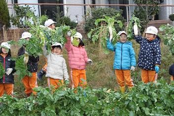 2018年12月12日 13時42分12月11日(火)、1年生が金賀さんの畑で2回目の「いもほり」に挑戦しました。おまけに今回は、隣に植えてあった大根の収穫(大根は「引く」というのですね)もさせていただきました。子どもたちは、自分の足よりも太い大根を、お土産にいただいてきました。子ども達は、自分自身で収穫させていただいたことで、大根はさつまいもと違って少し地面から出ていて、大きい割にはすぐに抜けることや、葉っぱが白い部分と同じくらいに大きいことなど、いろいろなことに気づくことができました。これを、食育のみならず様々な学習に発展させることができるよう、工夫していきたいと思います。金賀さん、本当にありがとうございました。