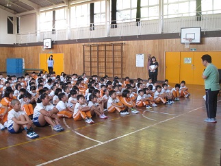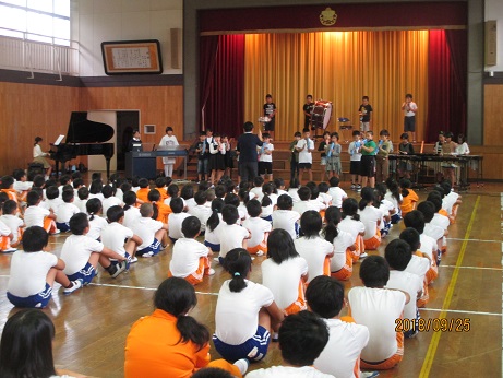 今日の大休憩に、体育館で、27日(木)の方部音楽祭に出場する4年生の「激励会」を行いました。校長からは、「一生懸命頑張っても失敗はある。失敗した友達を責めず、みんなでカバーしあうことが音楽でも大事。ステージでも練習と同じ演奏ができたら大成功。」と話をしました。その後、パートと曲目の紹介に続いて、いよいよ全校生の前で合奏「前前前世」の演奏です。1学期からずっと練習してきただけあって、最後までしっかり演奏することができました。一人ひとりが自分のパートに責任と自信を持っていることが分かりました。6年生の温かい「激励の言葉」や4年生の「お礼の言葉」も立派でした。