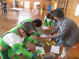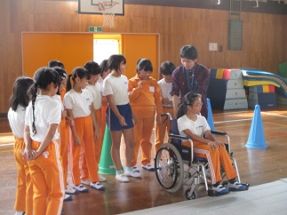今日は、「ハートフルなこそ」から職員の方々7名においでいただき、「高齢者疑似体験」を行いました。疑似体験用の装具を着けて歩いたり、文字を書いたりしました。また、車いすの体験もしました。子どもたちは、体が動かないことが思ったより大変なことや、それを理解して声をかけるなどの気づかいが大切なことを、身をもって知ることができました。ご指導いただいた職員の皆様、大変ありがとうございました。