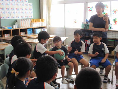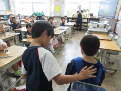 朝のふれあいタイムで、学級の仲間と「アウチ」をしました。