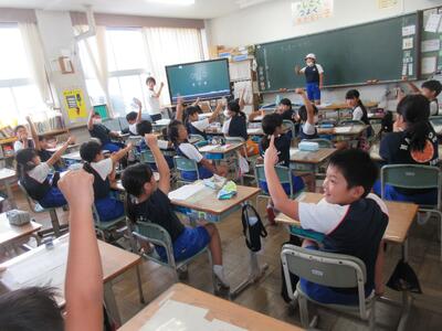 今日は、月に1度のふれあいタイムです。「ラッキー7」を行いました。グーなら0、指の数1~5を出して、みんなの合計が7になったら、ラッキーというゲームです。みんなが何を出すか考えて、自分はこれを出そうと決めて行う楽しさがあります。学級全員の合計が7になったところもありました。7にならなかった学級は次回がんばってください。