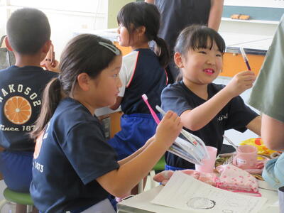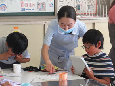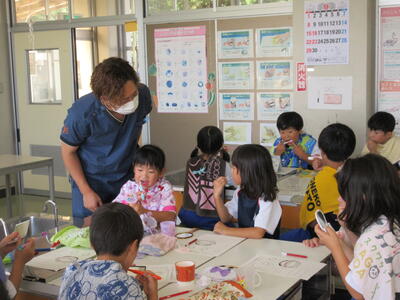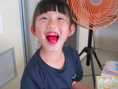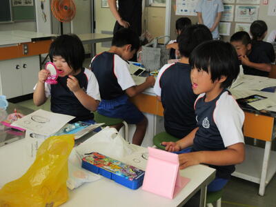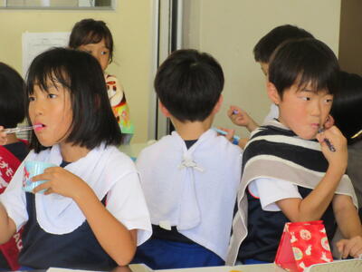 学校歯科医の吉田先生から、1,2年生に歯の磨き方指導がありました。染め出しをした後、丁寧なブラッシングの仕方を教えていただきました。初めは赤く染まっていた歯もきれいな白い歯に。また、歯の大切さやよくかんで食べることの意味についても教えていただきました。ありがとうございました。