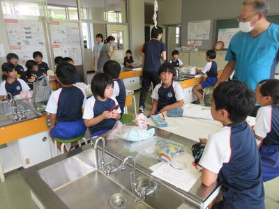2024年9月11日 15時24分学校歯科医の吉田先生から、1,2年生に歯の磨き方指導がありました。染め出しをした後、丁寧なブラッシングの仕方を教えていただきました。初めは赤く染まっていた歯もきれいな白い歯に。また、歯の大切さやよくかんで食べることの意味についても教えていただきました。ありがとうございました。
