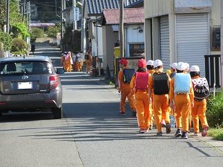 本校では集団登校を行っていますが、毎朝、写真のような登校の様子が見られます。赤帽子の班長を先頭に、1年生と手をつないで、きちんと2列で歩いています。1年生は車から離れた右側を歩くように、班長が配慮しています。何より、オレンジジャージがドライバーの注意を促しています。これが、4月6日の1学期初日から当然のように行われていることに感心するばかりです。素敵な勿来二小の姿です。