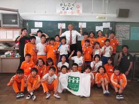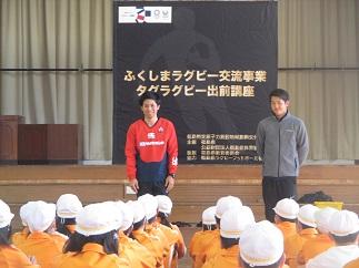 今日は、3・4校時目に6年生で、5・6校時目に5年生で、「タグラグビー出前講座」を行いました。タグラグビーとは、ラグビーと同じ形のボールを使い、前に投げてはいけないなどルールもほぼ同じですが、ボールを持った者が腰に付けたタグを取られることで、その場で止まってパスをしなければならない(=ラグビーの「タックルをされた」ということ)ところが、ラグビーとは違うところです。今日は、担当の福島県体育協会根本先生と講師の吉田先生、比嘉先生においでいただき、ご指導いただきました。子どもたちはすぐに上達し、2時間が終わるころには5対5で試合ができるまでになりました。子どもたちにとっては、とても楽しい、あっという間の2時間だったようです。遠いところおいでいただいた3名の先生方、たいへんありがとうございました。