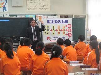 今日の3校時目に、6年生を対象に「租税教室」を行いました。講師として、さくら保険事務所の佐々木様、いわき法人会から石田様と森下様においでいただきました。自分たちの周りではどんなものに税金が使われ、自分たちの生活にどのように関わっているのか、身近なところから分かりやすく教えていただきました。また、今の6年生児童28名が入学から卒業までの6年間を過ごすにあたっては、合計約1億円の税金が使われていることも知りました。最後は、その1億円の「みほん」を全員で持ってみました。おいでいただいた3名の講師の皆様、お忙しい中、ありがとうございました。
