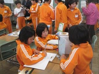 リアル防火教室は、全校児童を縦割りの15班に分け、3つの活動をローテーションで行いました。「活動1」では、家庭科室で市内の火災発生状況やその原因等をクイズ形式で学びました。「活動2」では理科室でタコ足配線などの火災危険さがしをしたあと、119番の通報訓練、「火事だー」とどれだけ大きな声で叫んだかを騒音計で測る活動、訓練用人形を使った心臓マッサージ訓練を行いました。「活動3」では、様々な災害想定を用いた避難訓練を行いました。