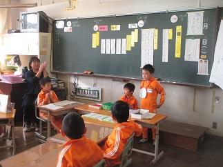 今日の2校時目に、1年生で学級活動の研究授業を行いました。「みんなでもっとなかよくなるためにできることを考えたい」との提案理由から、「どきどきわくわく大会をしよう」との議題で話し合う学習でした。自分の意見を話すばかりでなく、友達の話もしっかり聞いている姿がとても立派でした。司会や記録も児童が行いました。