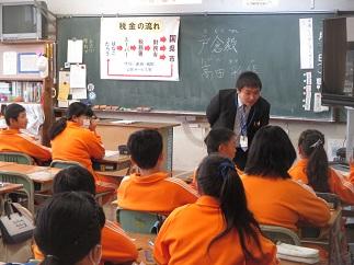 今日は、福島県いわき地方振興局県税部の戸倉毅さんと高田彩佳さんを講師にお迎えして、6年生で「租税教室」を実施しました。全員で税に関するDVDをみた後、身の周りのどのようなものに税金が使われているのか、税金は私達の生活にどのように役立っているのかなどを考えました。最後には、1億円のレプリカをみんなで持ってみて、その重さを実感しました。ちょうど今、来年10月の消費税率アップに関するニュースがさかんに流れていますが、今日の授業が、社会科の学習としてだけでなく、子ども達の身の周りのできごとに対する興味・関心を高めるきっかけになるといいなと思います。戸倉さんと高田さんには、お忙しい中おいでいただき、ありがとうございました。