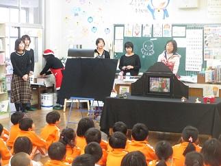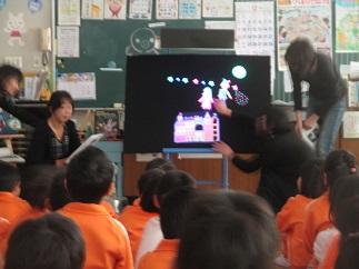 今日は、図書ボランティアの方々においでいただき、図書室で「クリスマスパネルシアター」を行っていただきました。全校児童は無理なので、1・2年生が鑑賞しました。演目は「ピーターパン」です。ブラックライトを当てると蛍光色に光る人形を使って演じてくださったので、子ども達は食い入るように見ていました。何日も前から準備くださった図書ボランティアの皆様、本当にありがとうございました。