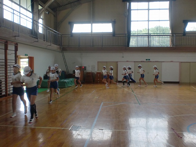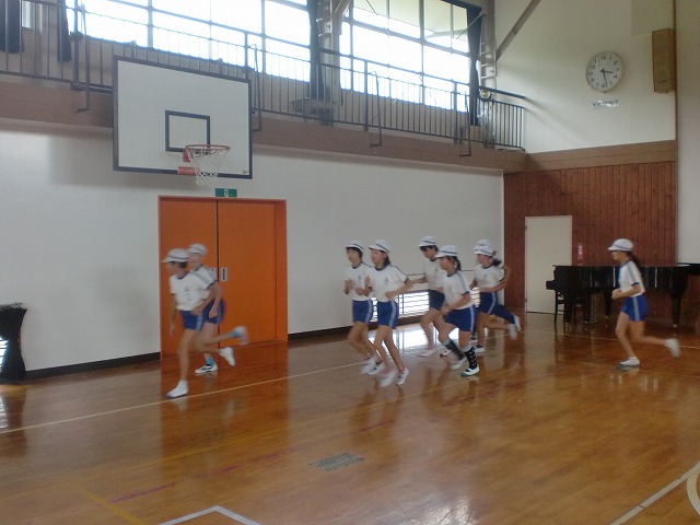 今月行われる大会(福島県小学生リレーカーニバル・クレハスポーツフェスティバル)に向けて、また自分の体力向上目指して、みんな一生懸命練習しています。最近は、天候が悪く体育館で練習しています。