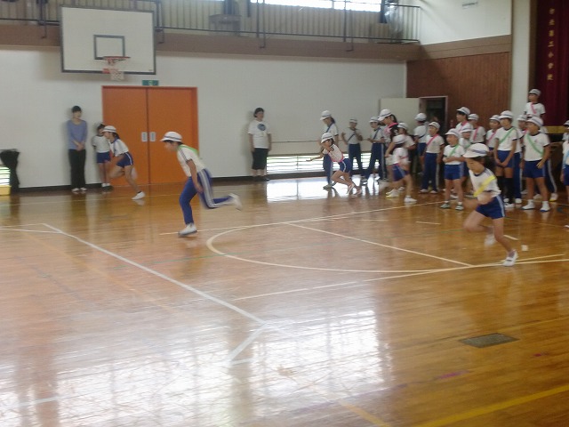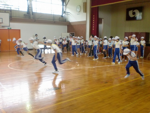 2校時終了後に、全校生が体育館に集合し、縦割り班の競走をしました。