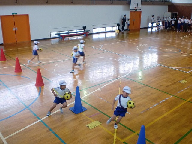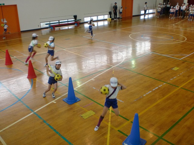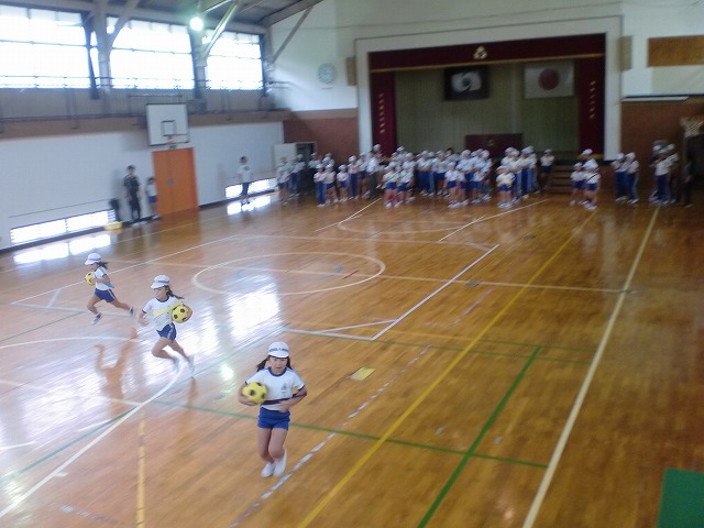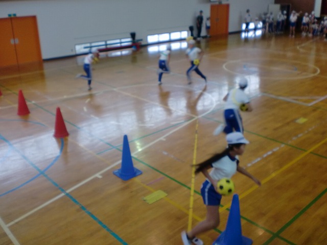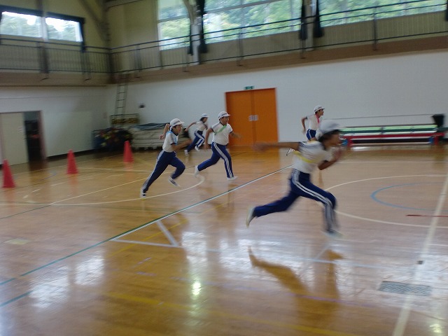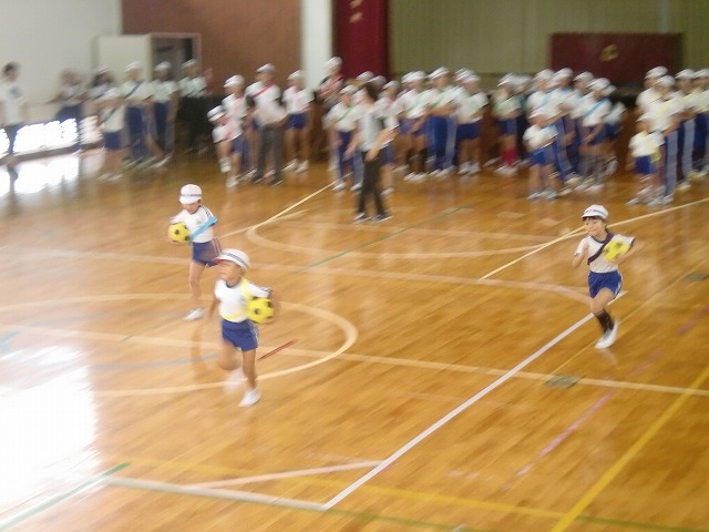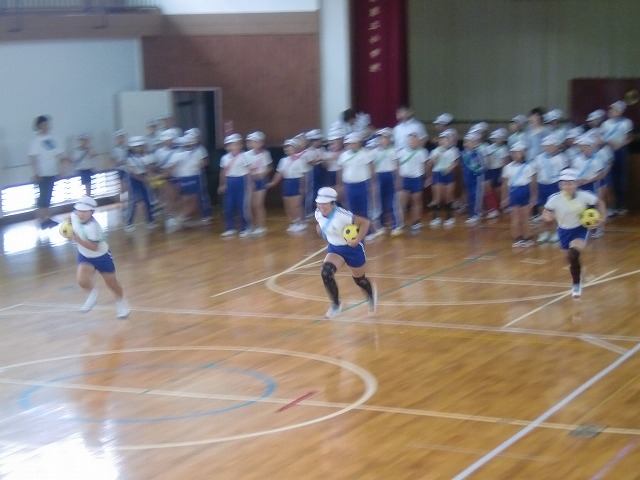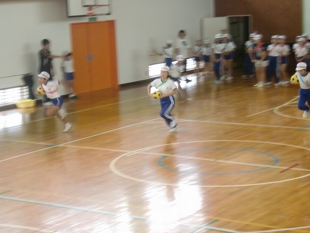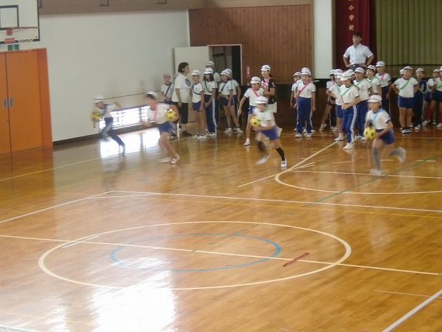 はじめに、折り返りリレーをし、次にボールを持ってのリレーをしました。