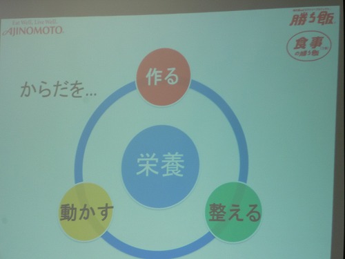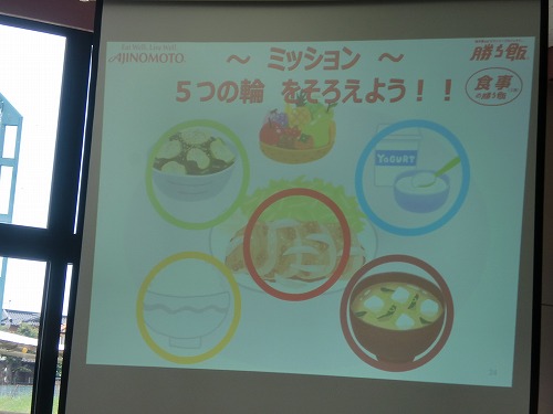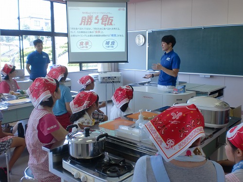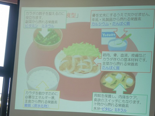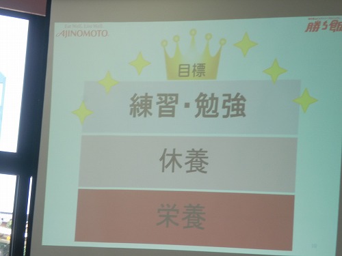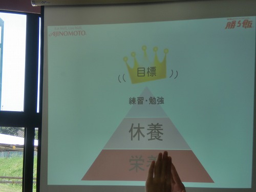 親子調理実習に先立ち、管理栄養士(元オリンピック選手)の先生から、勝ち飯の基本のお話がありました。
