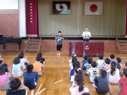スポーツチャンバラに福島県代表として全国大会に出場する4年生を紹介しました。30日に横浜市で開催されます。全校生で激励の拍手を送りました。自分の力を最大限発揮して、是非頑張ってきてほしいと思います。