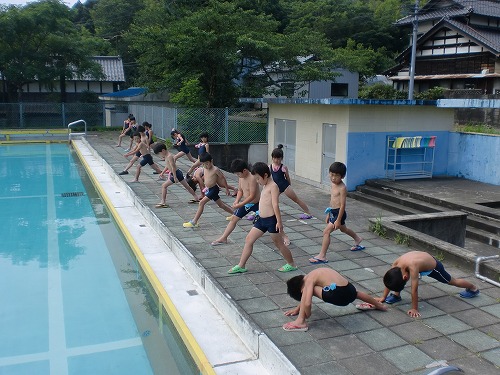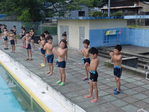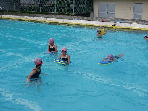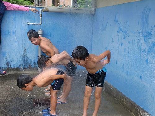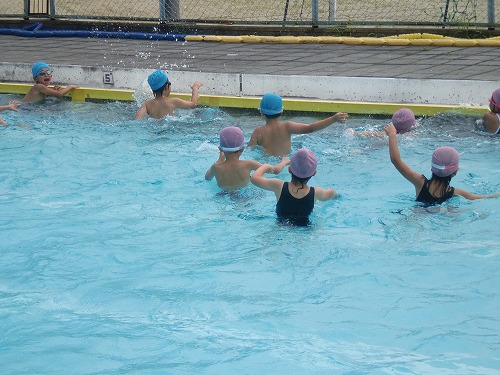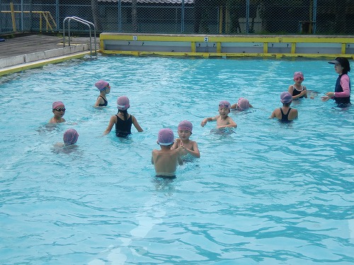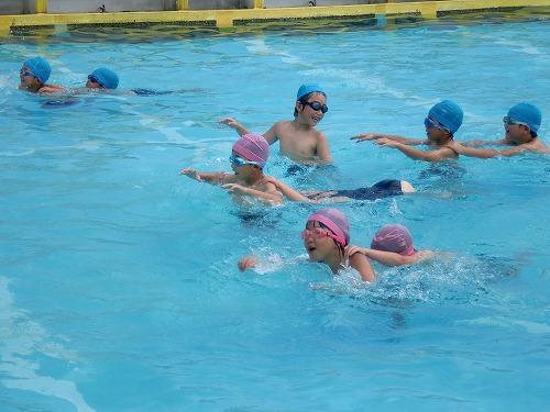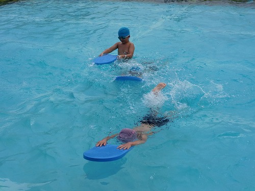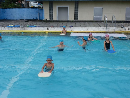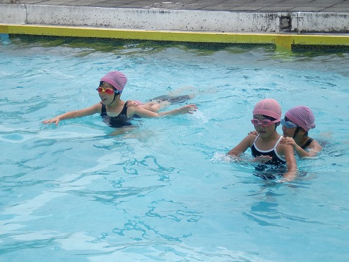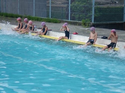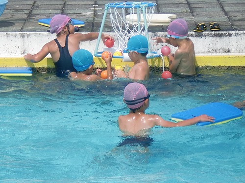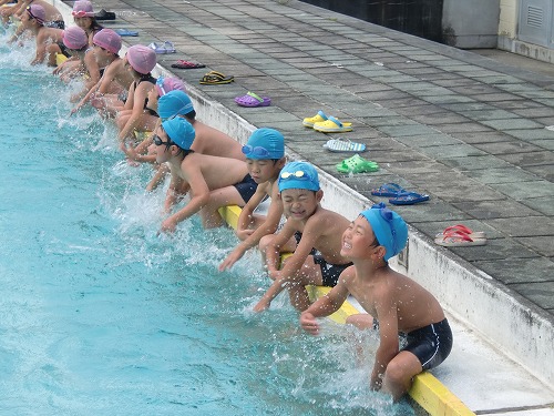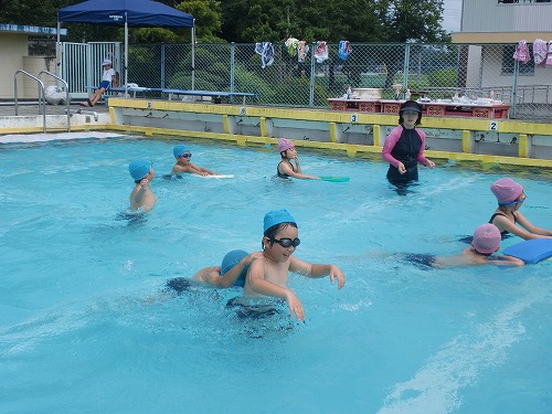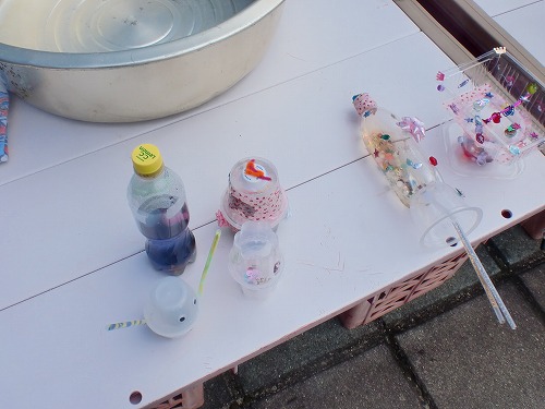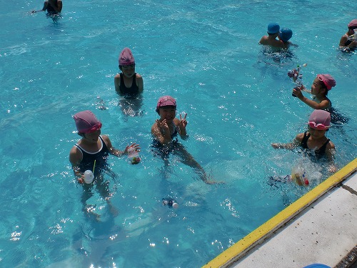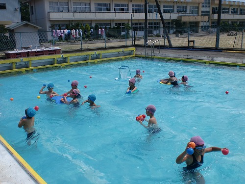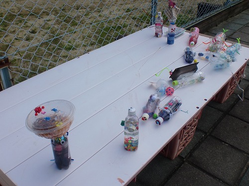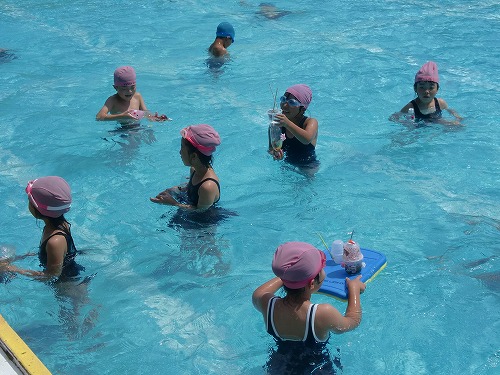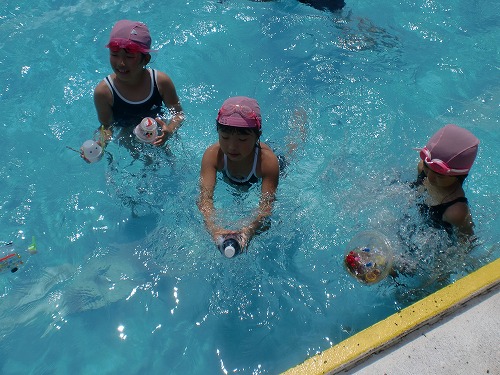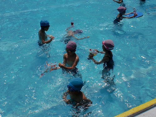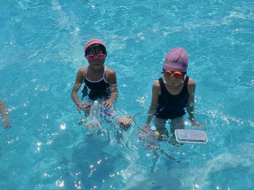 2年生の図工でつくった作品をプールで浮かばせてみました。