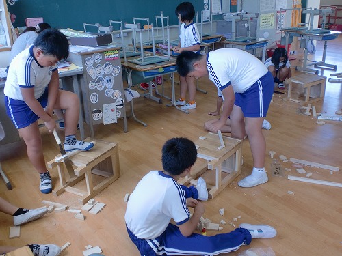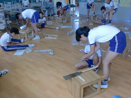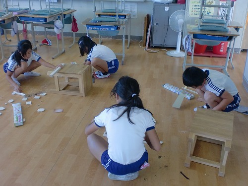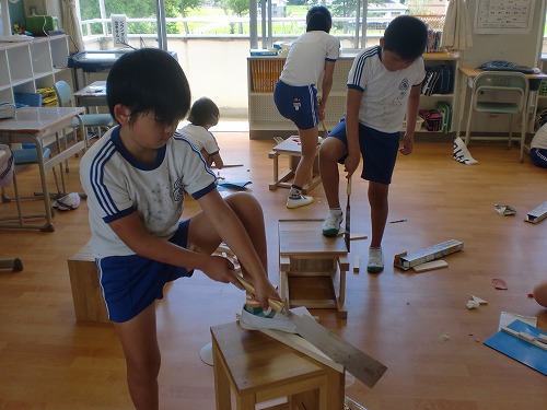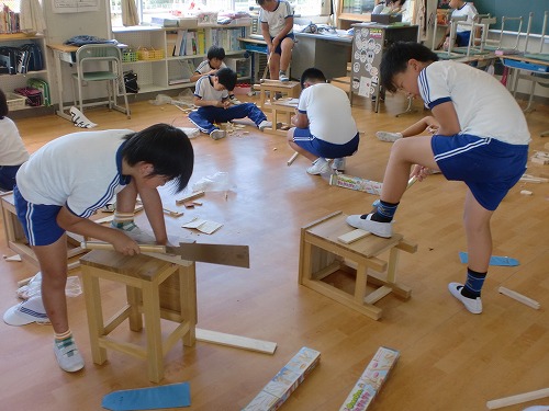 板をのこぎりで切って、自分で好きな作品(マイルーム、動物、ロケットなど)を作りました。
