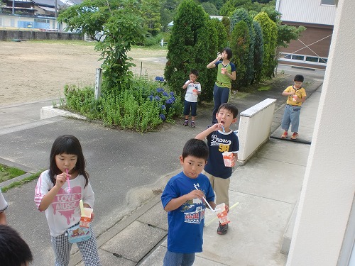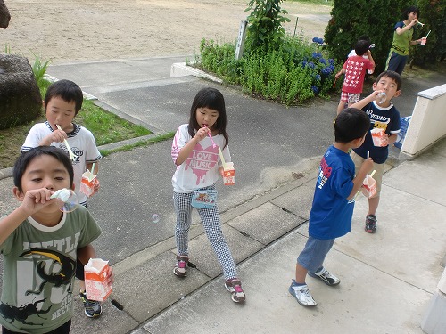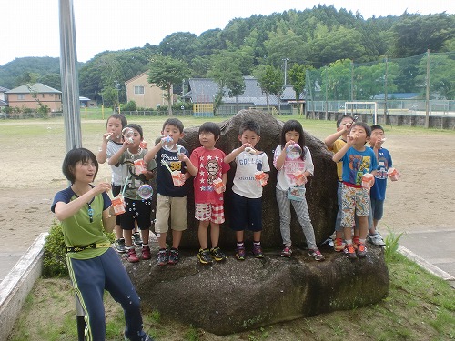 みんなで楽しそうにシャボン玉で遊んでいます。