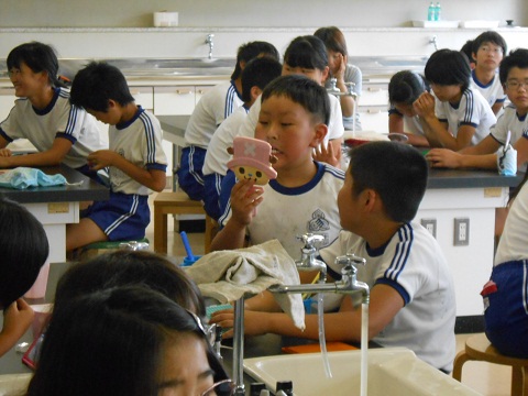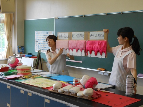 2015年6月19日 17時30分 中央歯科医院の歯科衛生士さん(2名)を講師にお迎えし、全学年で「歯科保健指導」を行いました。