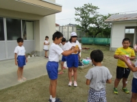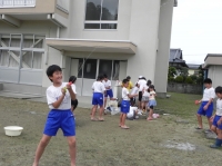 今日のチャレンジタイムは、全校生による水を感じる活動が行われました。縦割り班毎に、各自持ち良ったペットボトルや水鉄砲、バケツや風船などに水を入れ、飛び出す際の形の変化や水の軌道を体感しました。