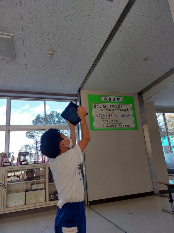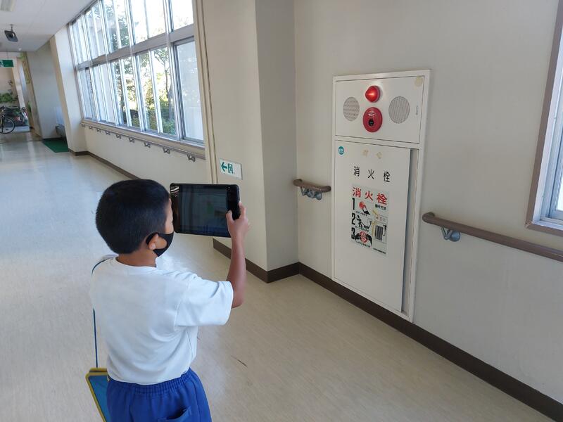 社会科の「火事からまちを守る」の学習で学校内の消防設備などを探していました。