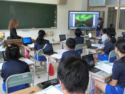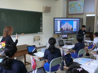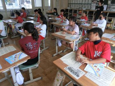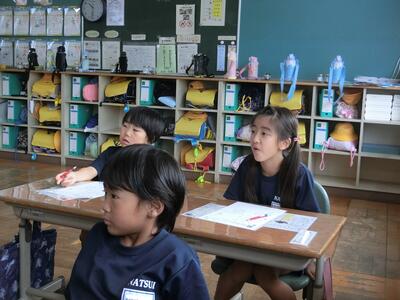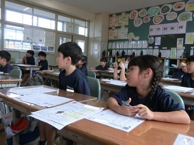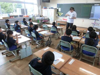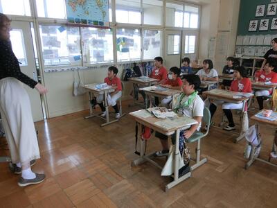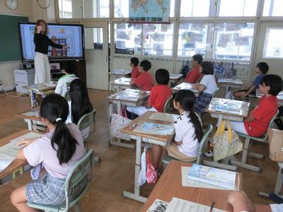 4年生は、ALTのコーデリア先生と、外国語活動で、文房具などの物の言い方の学習をしていました。単数と複数とで言い方が異なることも確認し、元気よく発音していました。