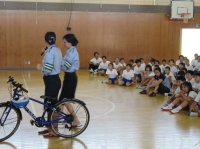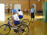 その後、いわき市交通安全対策協議会より来ていただいたお二人の講師の方々に、横断歩道の歩き方や、自転車の乗り方について具体的にご指導いただきました。